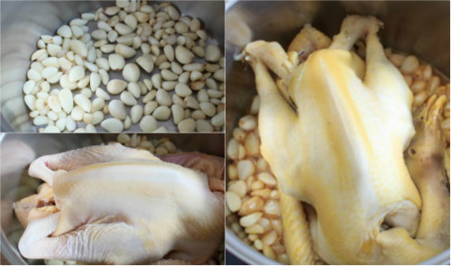 - Bóc vỏ tỏi, cắt lát sau đó sắp vào sao cho kín đáy nồi tương tự như lót nồi với muối. Phần tỏi kia cũng được bóc vỏ rồi nhét vào bụng gà.