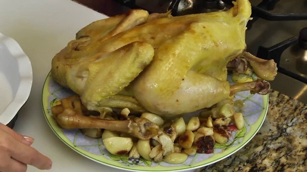 - Phần tỏi kia cũng được bóc vỏ rồi nhét vào bụng gà. Khối lượng của gà sẽ quyết định số lượng tỏi, tỉ lệ là 1,5 kg gà tương ứng với 1 củ tỏi.