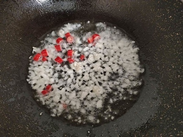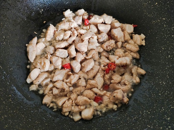 - Cho một chút dầu vào chảo, đổ tỏi vào phi cho thơm. Nếu ăn được cay, có thể xào cùng một vài lát ớt. Đổ gà vào chiên cho đến khi thịt chuyển màu, săn lại.