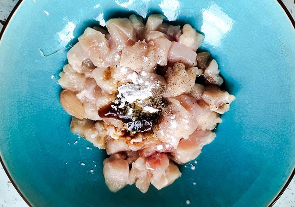 - Thịt ức gà làm sạch, thái miếng vừa ăn. Ướp thịt gà cùng ½ thìa cà phê gia vị, chút dầu hào, hạt tiêu và tinh bột. Thời gian ướp ít nhất 10 phút.