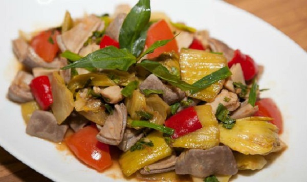 - Bước 3: Cho dạ dày vào xào cùng dưa chua, nêm lại gia vị cho vừa ăn, rồi cho rau thì là thái nhỏ vào, đảo đều, sau đó tắt bếp.