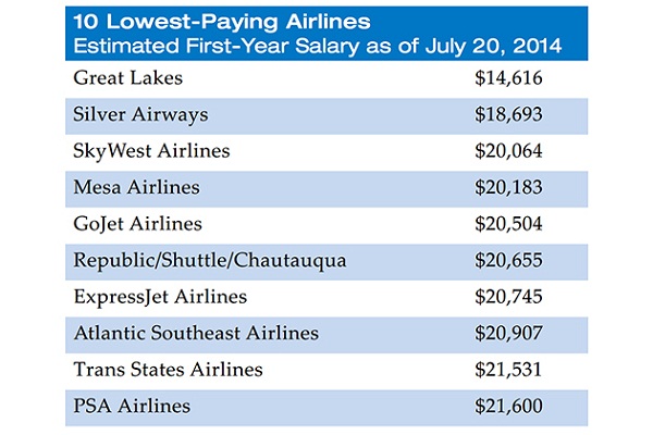 Hãng Great Lakes đứng đầu danh sách với mức lương cho phi công mới vào nghề là 14.616 USD/năm. Tiếp theo đó là hãng Silver Airways với 18.693 USD, SkyWest Airlines với 20.064 USD. Đứng cuối bảng 10 hãng hàng không trả lương thấp nhất là PSA Airlines với con số 21.600USD/năm cho những phi công khởi điểm vào nghề.