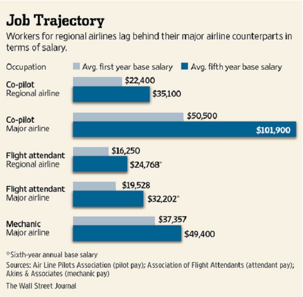 Mức lương một năm của phi công đồng hành (co - pilot), nhân viên phục vụ trên máy bay (flight attendant) và kỹ sư hàng không (mechanic) tại hãng hàng không địa phương (regional airline) và hãng hàng không lớn (major airline).Màu xanh nhạt : mức lương khởi điểm Màu xanh đậm: mức lương sau 5 năm. |