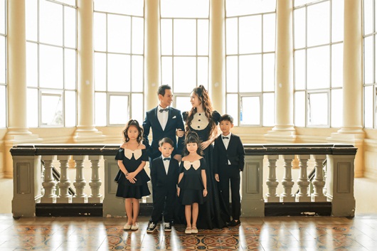 Trong bộ ảnh kỷ niệm 10 năm ngày cưới, vợ chồng Lý Hải - Minh Hà diện đồ cô dâu chú rể hạnh phúc bên đàn con dễ thương. |