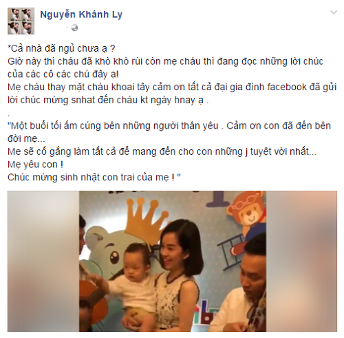 Trên trang cá nhân, Khánh Ly đã chia sẻ đoạn clip trong buổi sinh nhật của con trai mình với dòng chia sẻ hạnh phúc: "Một buổi tối ấm cúng bên những người thân yêu. Cảm ơn con đã đến bên đời mẹ...Mẹ sẽ cố gắng làm tất cả để mang đến cho con những gì tuyệt vời nhất...Mẹ yêu con! Chúc mừng sinh nhật con trai của mẹ!".
