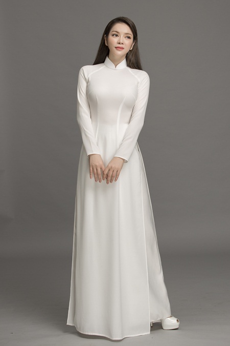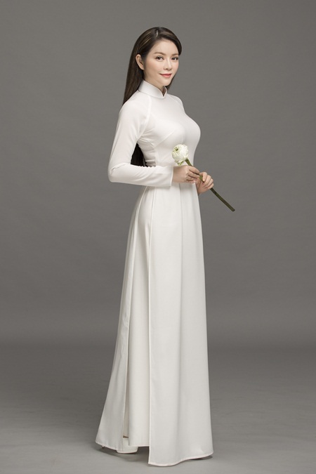 Bộ áo dài trắng của Thuận Việt được thiết kế theo phom dáng truyền thống với phần cổ cao, tay áo dài, ôm sát như in vào vóc dáng của người đẹp. Chất liệu voan và lụa mềm góp phần tôn trọn số đo ba vòng gợi cảm của cô. Trong trang phục này, người đẹp họ Lý trông như thiếu nữ Việt xưa, dịu dàng, đằm thắm.