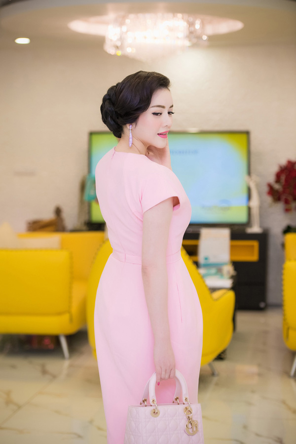 Cô diện trang phục nhẹ nhàng và thanh lịch với gam màu hồng pastel. |