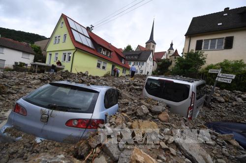 Xe � t� b? ch�n v�i trong l?p ??t ?� sau m?a l? ? Braunsbach, ??c ng�y 30/5. - ?nh: EPA/TTXVN. |