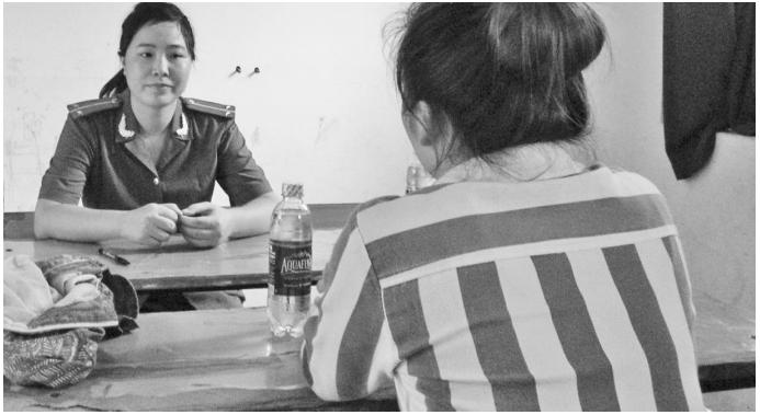 Cán bộ trinh sát Nguyễn Thị Thu Hương và phạm nhân Thoa tại trại giam Ngọc Lý, Bắc Giang. |