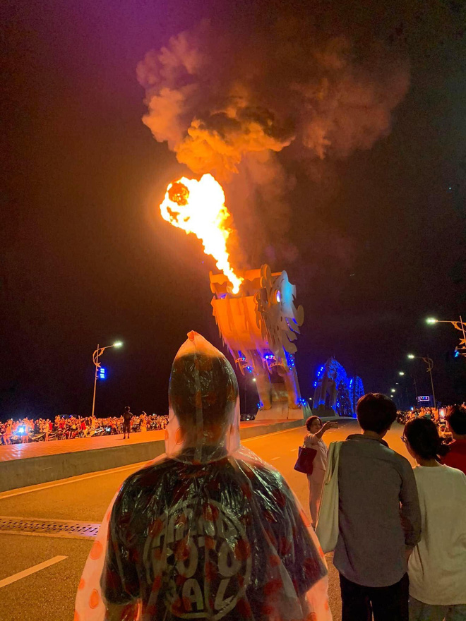 Một buổi tối trời quang mây tạnh, không có dấu hiệu của một cơn mưa nhưng nam thanh niên vẫn mặc áo mưa đứng ngắm cầu Rồng Đà Nẵng khiến ai nấy xung quanh đều tò mò.