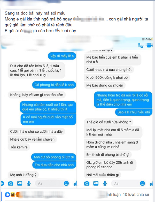 Cô gái sau đó đã xuống giọng, hứa sẽ đưa tiền cho nhà trai mà anh chàng này vẫn khăng khăng không chịu chi và đưa ra lý do: "Mẹ anh không cho". Thậm chí, cô nàng còn khẳng định thể diện nhà gái quan trọng hơn tiền bạc, người này còn lên mặt: "Thế giờ có cưới nữa không. Em bỏ đây 20 triệu anh đưa 5 triệu cho" và không quên "ném" cùng lời sát thương cô gái.