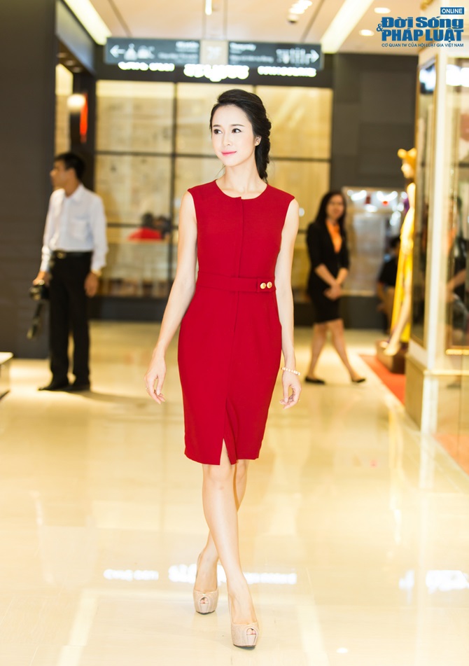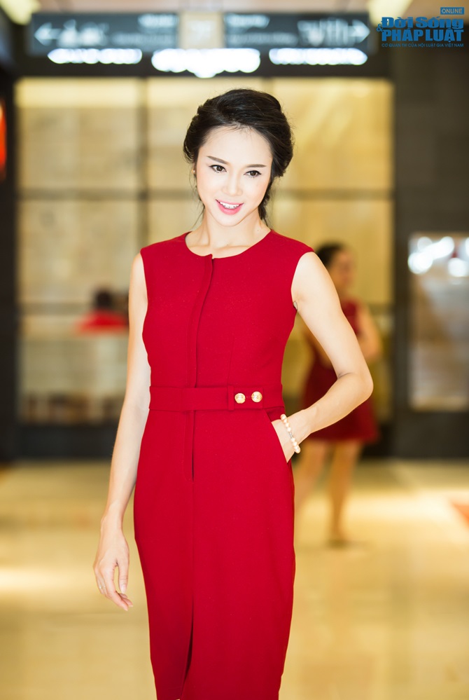 | Ngọc Anh xuất hiện trong bộ đầm màu đỏ nổi bật khoe làn da trắng sứ. |
