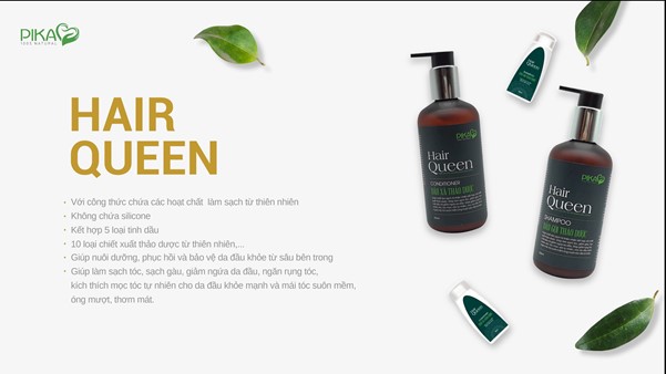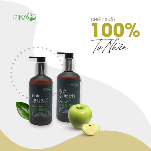 Bộ sản phẩm chăm sóc tóc Hair Queen của Pika với chiết xuất các dược liệu từ thiên nhiên, được kết hợp từ 5 loại tinh dầu cùng 10 loại thảo dược quý (Chiết xuất Hà Thủ Ô đỏ, Cỏ Mực, Diếp Cá, Lá Trúc Đen, Tầm Ma, Cỏ Mần Trầu, Bồ Kết, Chiết xuất Giấm Táo Thụy Sĩ, Hoa Cẩm Quỳ, Hoa Lạc Tiên) sẽ giúp nuôi dưỡng tóc, giúp tóc mọc chắc khỏe và ngăn rụng tóc.