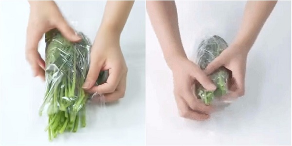 + Bước 2: Tiếp theo dùng màng bọc thực phẩm bọc rau lại khoảng vài lớp (nhớ bọc kín cả 2 đầu).