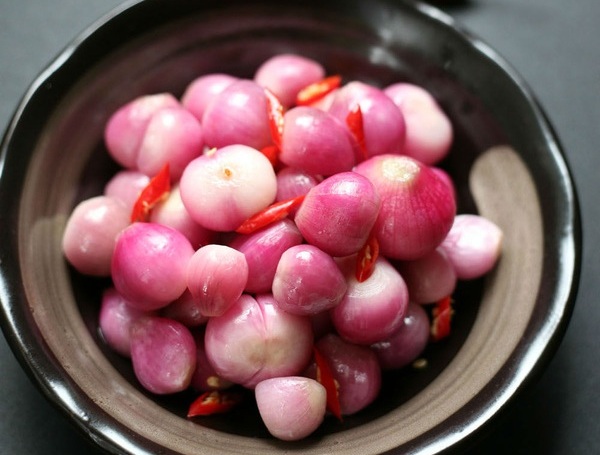 Món hành tím muối xổi vẫn còn nguyên màu tím hấp dẫn, hành giòn, vị chua ngọt vừa ăn kết hợp cùng thịt đông, bánh chưng, các loại giò chả vô cùng ngon miệng.