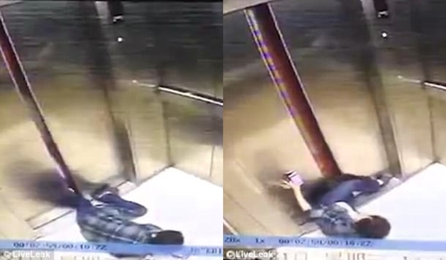 Máy quay camera trong thang máy đã ghi lại cảnh một phụ nữ tóc ngắn đang mải nhìn điện thoại trong tay khi bước vào thang máy. Vì không nhìn đường nên cô ta bị vấp ở cửa thang máy và ngã xuống sàn.