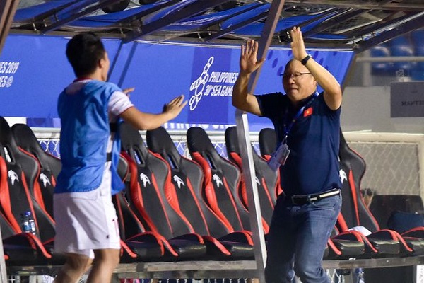 Sau khi lao ra đường biên ăn mừng với các trợ lý về bàn thắng của Đỗ Hùng Dũng, HLV Park Hang Seo cũng không quên chạy về băng ghế dự bị chia vui với Quang Hải.
