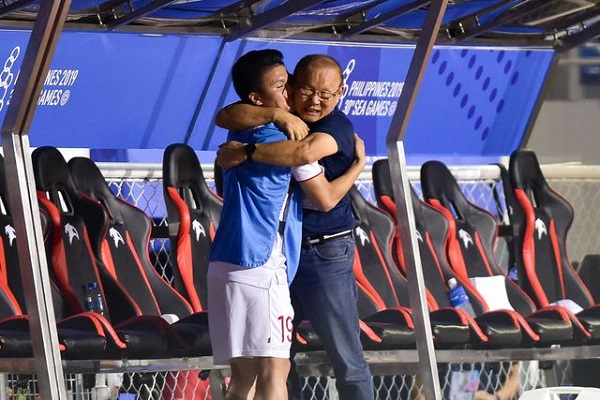 Và ở giây phút vỡ òa hạnh phúc đó, HLV Park Hang Seo và các trợ lý đã nhảy lên ăn mừng sung sướng. Thế nhưng chỉ một phút sau, thầy Park liền rời đường biên quay lại băng ghế dự bị. Ông tiến đến ôm chầm lấy Quang Hải.