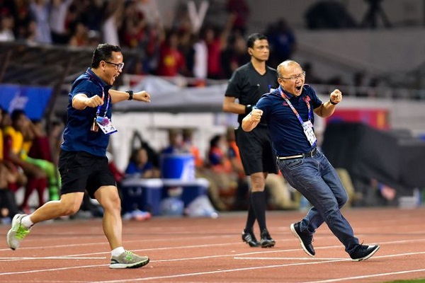 Thầy Park và các trợ lý nhảy lên vì sung sướng khi Hùng Dũng ghi bàn - Ảnh: Dân trí |