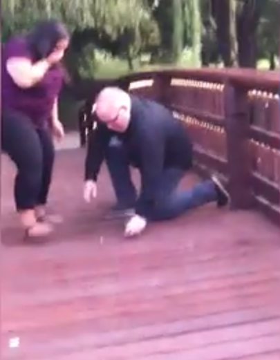 Trên cây cầu gỗ nên thơ, chàng quỳ gối xuống cầu hôn cô gái, dâng lên chiếc nhẫn kim cương. Chắc do quá run, nghi thức cầu hôn của chàng thành thảm họa...