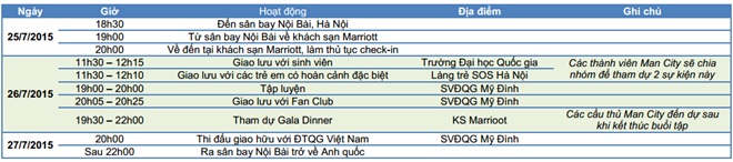 Đáng tiếc là một nửa cầu thủ trong đội hình chính thức không thể góp mặt. Đó là Pablo Zabaleta, Martin Demichelis, Sergio Aguero (được nghỉ sau Copa America 2015), Fernandinho, Yaya Toure, Fabian Delph (chấn thương) và Vincent Kompany (về nhà chăm vợ đẻ). Thế nhưng, những cái tên còn lại như Samir Nasri, Fernando, Gael Clichy, ... cũng đủ sức làm khán giả Việt Nam háo hức chào đón.