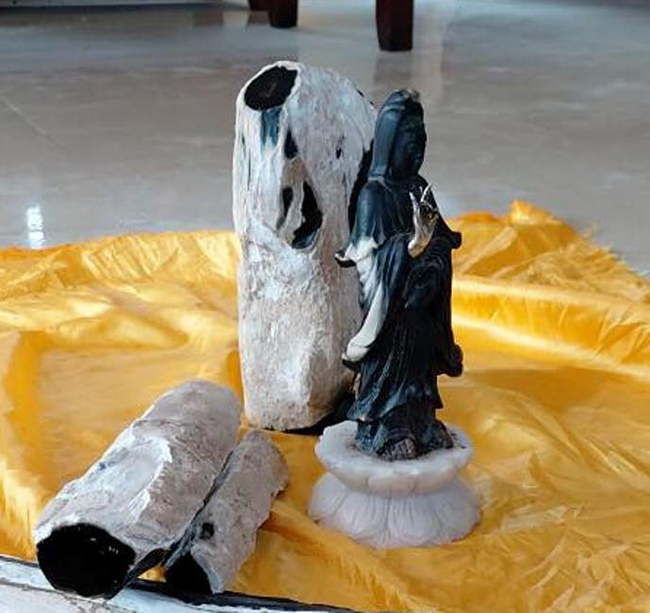 Được biết, khối trầm hương này có trọng lượng hơn 3kg bao gồm: 1 tượng phật bà Quan âm cùng 3 thanh Kỳ nam đã hóa thạch.