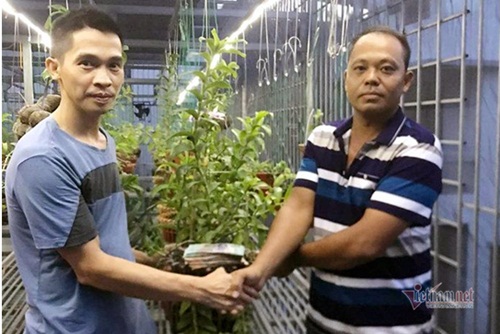 Anh Sơn (bên trái) đang giao dịch lan tại vườn với khách. Ảnh: VietNamNet |