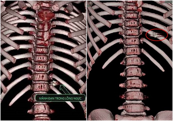 Hình ảnh chụp 3D lồng ngực bằng hệ thống máy 512 lát giúp các bác sĩ xác định chính xác vị trí mảnh đạn găm trong lồng ngực bệnh nhi.