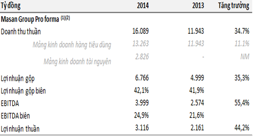 Theo đó, Masan có kết quả doanh thu ấn tượng: EBITDA và lợi nhuận thuần năm 2014 tăng lần lượt 34,7\%, 55,4\% and 44,2\%.