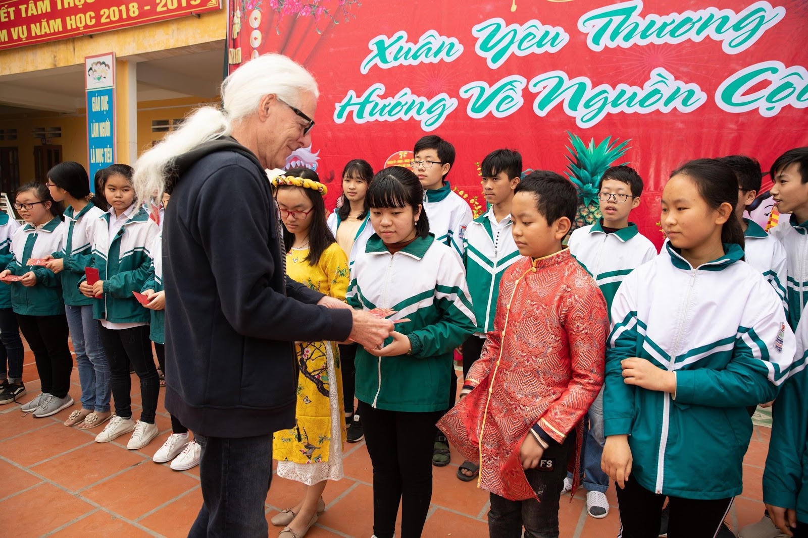 Yêu quý sự bình dị và gần gũi của “bác Jef”, các em học sinh rất thích vây quanh ông để trò chuyện về ý nghĩa Tết cổ truyền của người Việt |