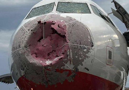 Hình ảnh công bố trên internet cho thấy máy bay Airbus A320 bị dập nát phần mũi và nứt nghiêm trọng phần kính buồng lái sau khi đi qua khu vực mưa đá trong một trận bão lớn.