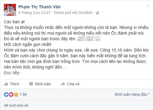 Dòng trạng thái của Ốc Thanh Vân lên tiếng về việc bị bạn thân mượn danh nghĩa lừa tiền người khác. |