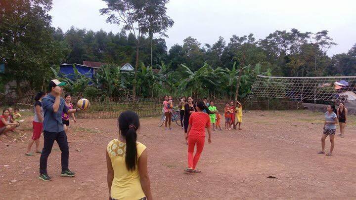 MC Phan Anh và chị em vùng lũ đã có những giấy phút vui chơi bóng chuyền cùng nhau. |