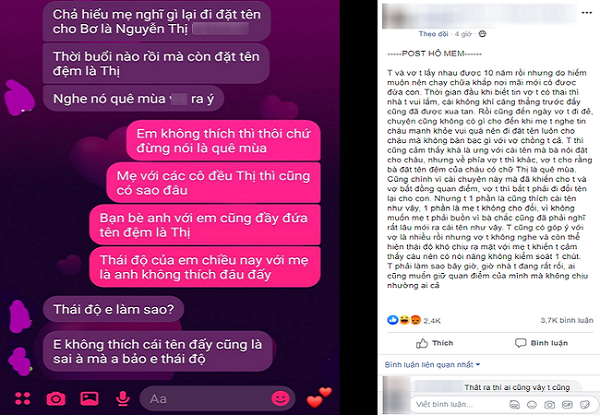 Chuyện cũng không có gì cho đến khi mẹ mình nghe tin cháu mạnh khỏe, vui quá nên đi đặt tên luôn cho cháu mà không bàn bạc gì với vợ chồng mình cả! Mình thì cũng cảm thấy khá là ưng với cái tên mà bà nội đặt cho cháu, nhưng về phía vợ mình thì khác. Cô ấy cho rằng bà đặt tên đệm của cháu có chữ "Thị" là quê mùa.
