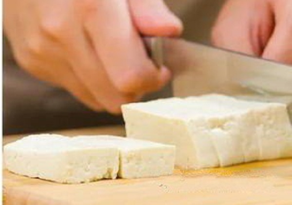 - Đậu phụ chần qua nước sôi sau đó vớt ra thái miếng, cho vào bát rồi dùng thìa nghiền nát.