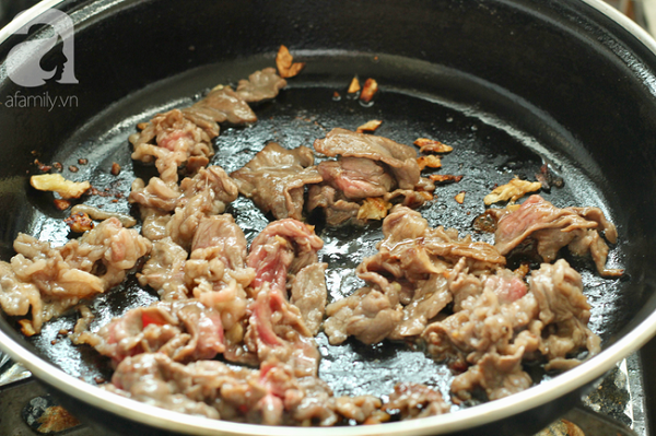 - Bước 4: Cho chảo lên bếp, thêm 1 muỗng canh dầu ăn vào, cho tỏi băm vào đảo đều rồi trút thịt bò vào xào chín thì lấy thịt ra bát.