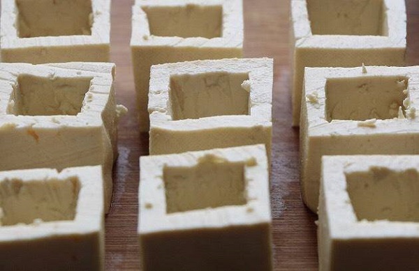 - Cắt đậu phụ thành các miếng vuông vừa ăn, dùng dao khoét lỗ vuông ở giữa miếng đậu.