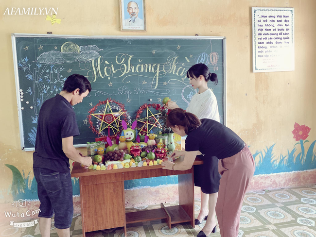 Cô giáo "chị Hằng" tự tay chuẩn bị mâm cỗ cho học trò. |