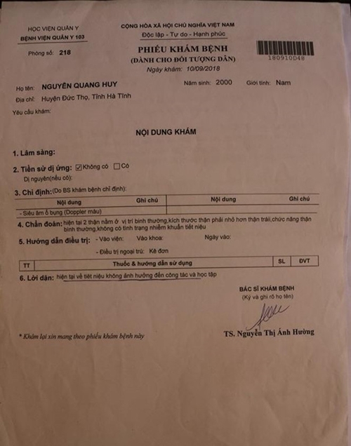 Kết quả khám sức khỏe của Huy tại Bệnh viện 103 - Bộ Quốc phòng - Ảnh Tiền phong. |