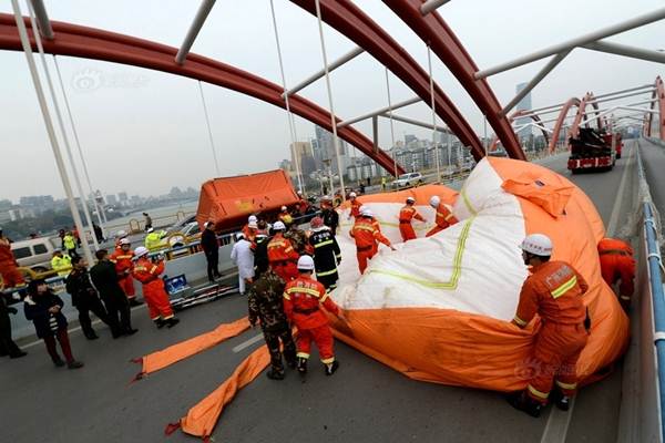 Sau đó, đội cứu hộ đã nhanh chóng có mặt tại hiện trường, nhưng mọi thuyết phục, thương lượng đều không đạt kết quả. Sau hai giờ đồng hồ, đội cứu hộ đã quyết định trải đệm phía dưới trên một diện tích lớn để có thể hạn chế mọi tình huống xấu nhất có thể xảy ra.