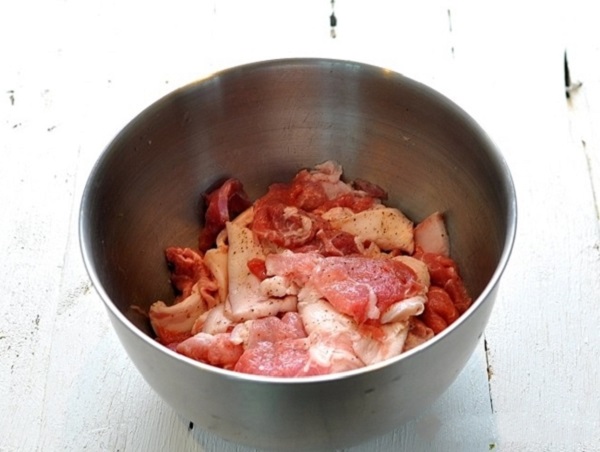- Bước 1: Thịt rửa sạch, thái lát mỏng rồi cho vào tô, thêm rượu nấu ăn và hạt tiêu vào trộn đều.