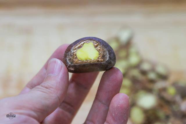 - Lấy một hạt dẻ, theo đường rạch nhẹ nhàng bẻ đôi hạt dẻ và vỏ rồi cùng tách ra.