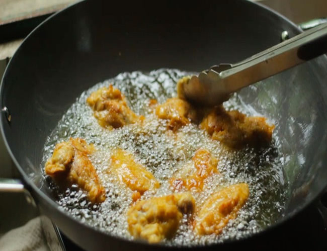- Chiên gà ngập dầu và chỉ bắt đầu chiên gà khi nhiệt độ dầu từ 185-190 độ C hoặc tương đương với 375 oF.
