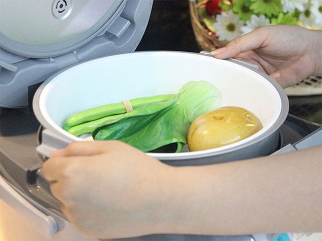 Cho rau củ vào xửng hấp. |