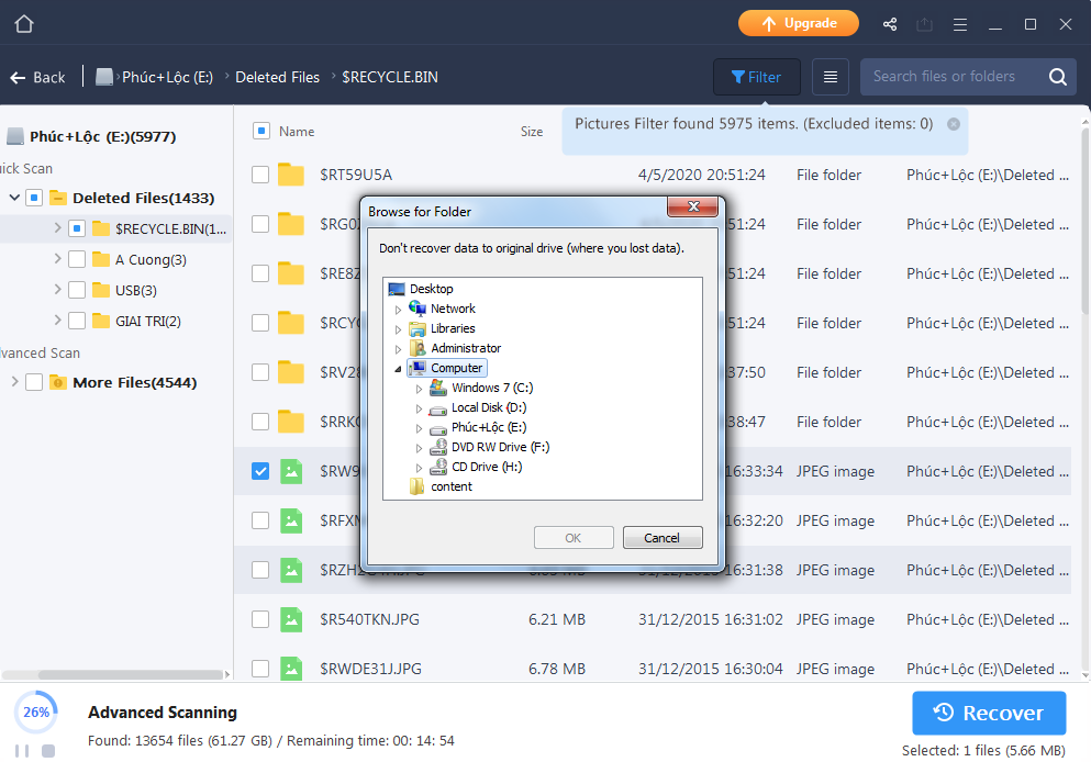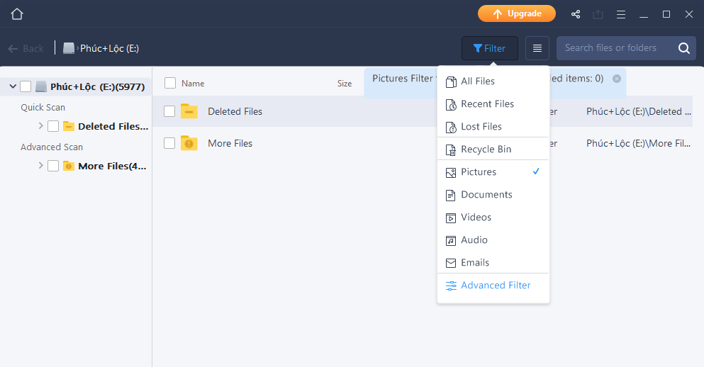 Thông thường khi quét thì tất cả các loại dữ liệu bị xóa sẽ hiện ra, nếu bạn chỉ muốn tìm file hình ảnh thì bạn sẽ sử dụng bộ lọc để quá trình tìm kiếm diễn ra nhanh hơn.