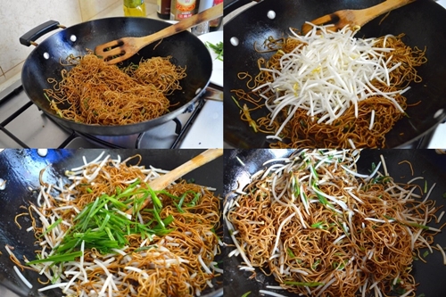 Đặt lại chảo lên bếp, cho 1 muỗng dầu nữa rồi cho hành lá vào đảo qua rồi cho mì vào xào cùng. Lúc xào nhớ hất nhah tay, tách mì ra cho đều. Thêm hỗn hợp nước tương và xào tiếp cho đến khi mì có màu vàng sậm thì thêm giá đỗ.