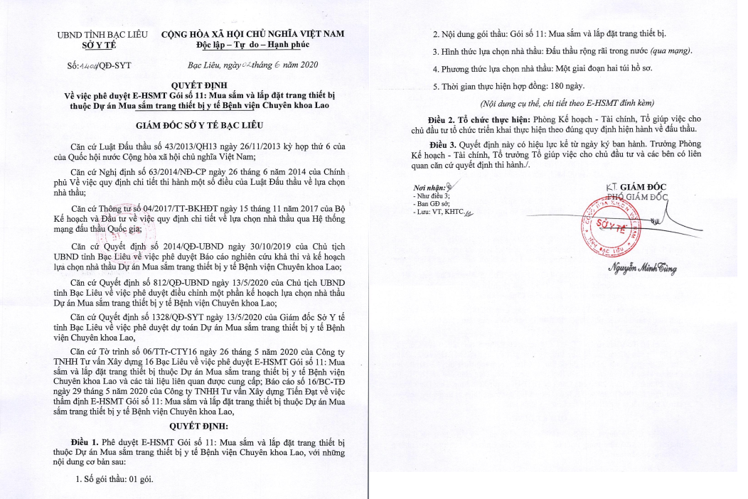 | Quyết định phê duyệt E-HSMT của Sở Y tế Bạc Liêu |
