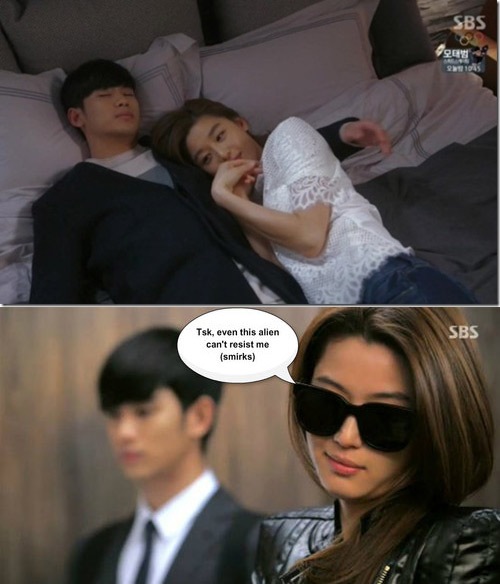 Những tấm hình thể hiện nghệ sỹ Trung Quốc đóng lại hoàn hảo cảnh “mỹ nam ngoài hành tinh” Do Min Joon và “minh tinh trái đất” Cheon Song Yi. Ngôi sao Hoa ngữ tái hiện lại điệu bộ kênh kiệu của Cheon Song Yi khi lần đầu nhìn thấy Do Min Joon cho đến cảnh nằm chung giường với trai đẹp mặc dù chỉ là những tấm hình ghép.