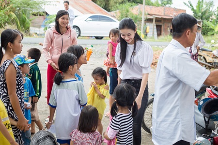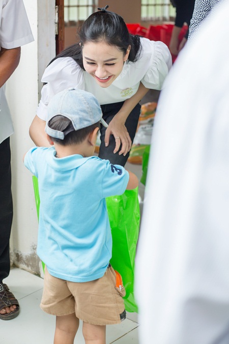 Không chỉ chia sẻ khó khăn với các hộ nghèo tại địa phương, đoàn còn trao 60 phần quà trung thu cho các em thiếu nhi tại đây. Hà Thu và Hoa hậu Hằng Nguyễn tận tình gửi đến các em từng chiếc lồng đèn, từng cái bánh trung thu, chúc các em có một mùa trung thu ấm áp và vui vẻ.