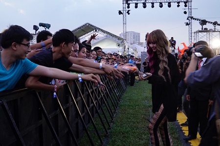 Nhiều khán giả hào hứng nhảy theo MLee, cổ vũ nữ ca sĩ nhiệt tình. Trước đó, cô nàng không ngần ngại selfie và giao lưu với người hâm mộ.